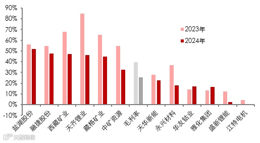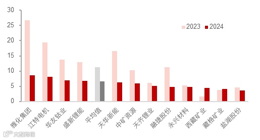 图表20:A股12家锂上市公司毛利率——2023&2024年度