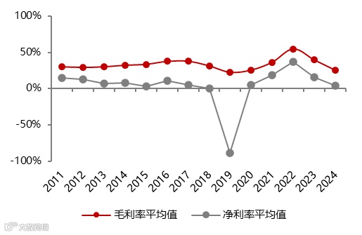 12家A股锂上市企业2024年毛利率25.38%,同比下降14.2pct;净利率4.52%,同比下降11.6pct。自锂价下探以来,上市公司盈利能力大幅下降,毛利率与净利率跌至上轮周期底部位置。