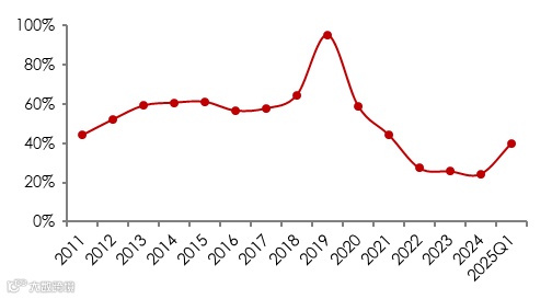 分季度来看,2024年以来,上市公司现金比率逐季下滑,2025Q1为0.76,同比下滑21pct,环比下滑6.2pct;资产负债率逐季提高,2025Q1为40.04%,同比增0.88pct,环比增0.84pct。锂价持续低迷下, 公司偿债能力难以出现反转情况。