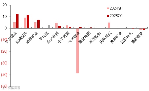 分季度来看,2024年前三季度企业营业能力出现稳定向好态势,但Q4 天齐受资产减值和投资收益变动等情况拖累,净利润环比下降较多,拖累整体锂板块业绩。2025Q1天齐归母净利润扭亏,环比增23亿元至1.04亿元,带动锂板块净利率环比增7.6pct至10.84%。