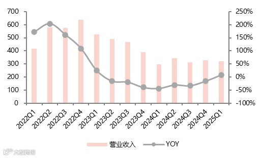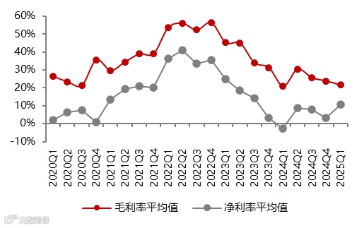 分季度来看,2024年上市公司季度营业收入稳定,无明显性季节变化,新项目增产对冲了价格持续下跌带来的不利影响。公司营业收入同比有所好转。2025年Q1 样本企业营业收入320亿元,同比增加7.87%,近2年来首次转正,主要系锂价环比变化基本持平。