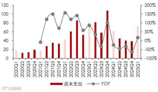 分季度来看,2024年上市公司资本开支整体平稳,未出现下半年投资情况增加的情况,一是因为企业当下现金流情况紧张,无多余资金进行远期项目建设;二也反应了企业家对未来需求或存在观望情绪。进入2025年,一季度上市公司资本开支为73.29亿元,同比增加18.11%,整体支出处于近三年来平均水平。