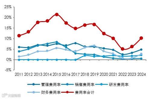 12家A股锂上市企业2024年四费费用共计122亿元,同比增长14.6%;四费费用率为9.53%,同比增加3.83pct。2024年企业销售费用、管理费用和研发费用绝对值均处于下降状态,但财务费用增加较多,其中天齐锂业、华友钴业财务费用分别同比增加8.83、5.92亿元,是财务费用增加最多的两家公司。天齐主要系子公司文菲尔德因银行贷款存在大额美元负债敞口,美元增值导致澳元对美元产生较大的汇兑损失,华友钴业主要系年度利息费用增加。