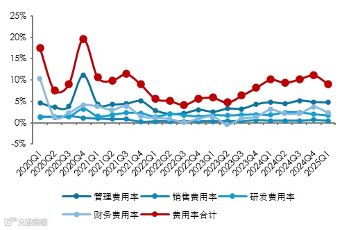 分季度来看,12家A股锂上市企业2025年Q1四费费用共计24.31亿元,同比减少 11.13%;四费费用率7.6%,同比下降1.62pct。排除财务费用的季度波动影响,公司在管理费用和销售费用上基本维持稳定,费用下降空间已所剩无几。