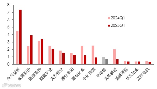 永兴材料、天齐锂业与天华新能是锂矿上市公司管理层面,控制成本较好的公司。我们发现永兴材料和盐湖股份等海外业务涉及较少的公司,2024和2025Q1的管理费用率较低,同时财务费用少,不易受汇率波动等影响造成大额财务支出。