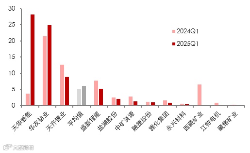 图表33:2025Q1 A股12家锂上市公司资本开支(亿元)