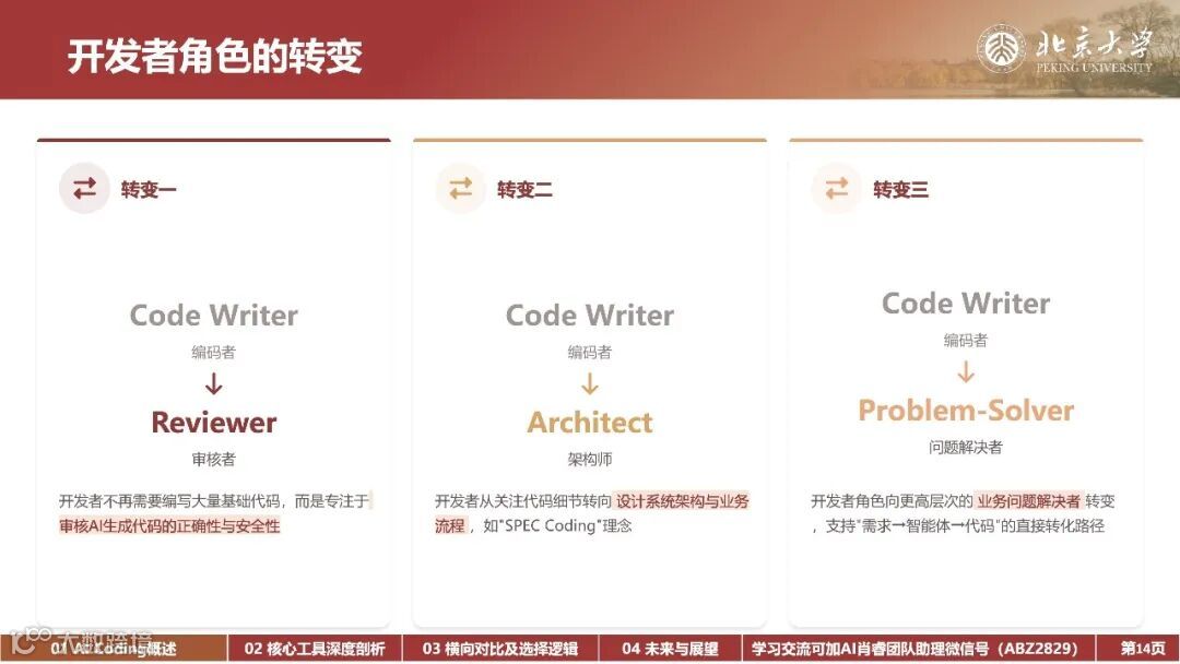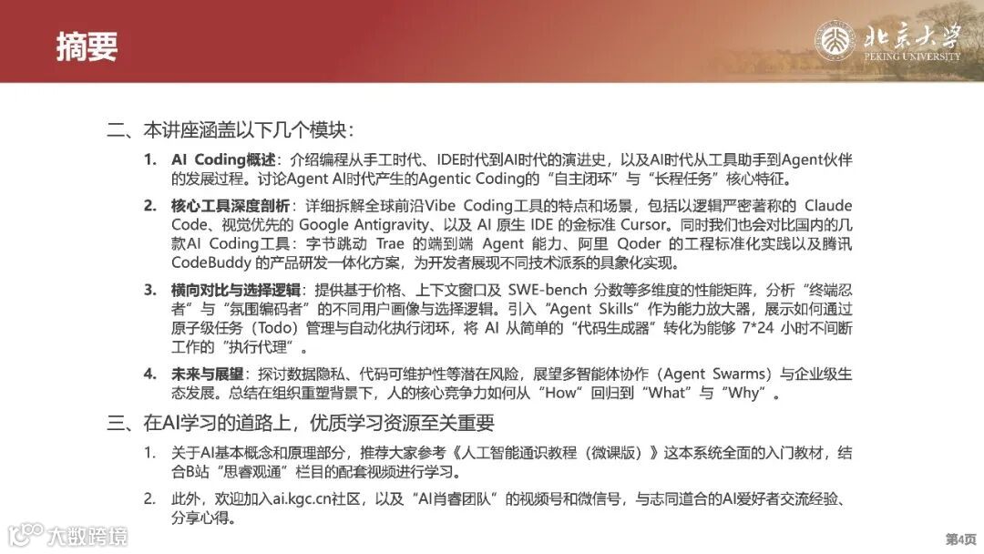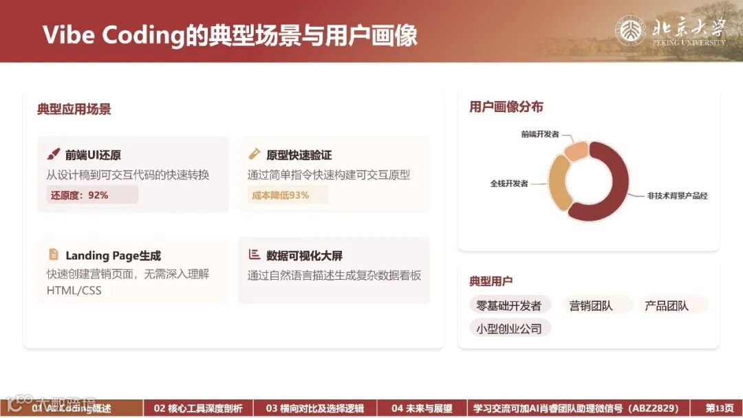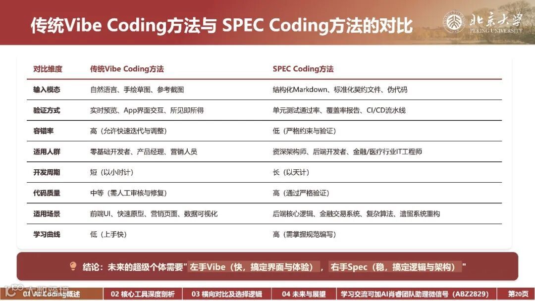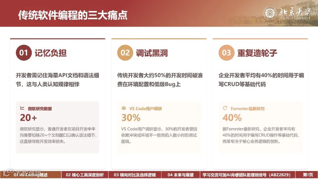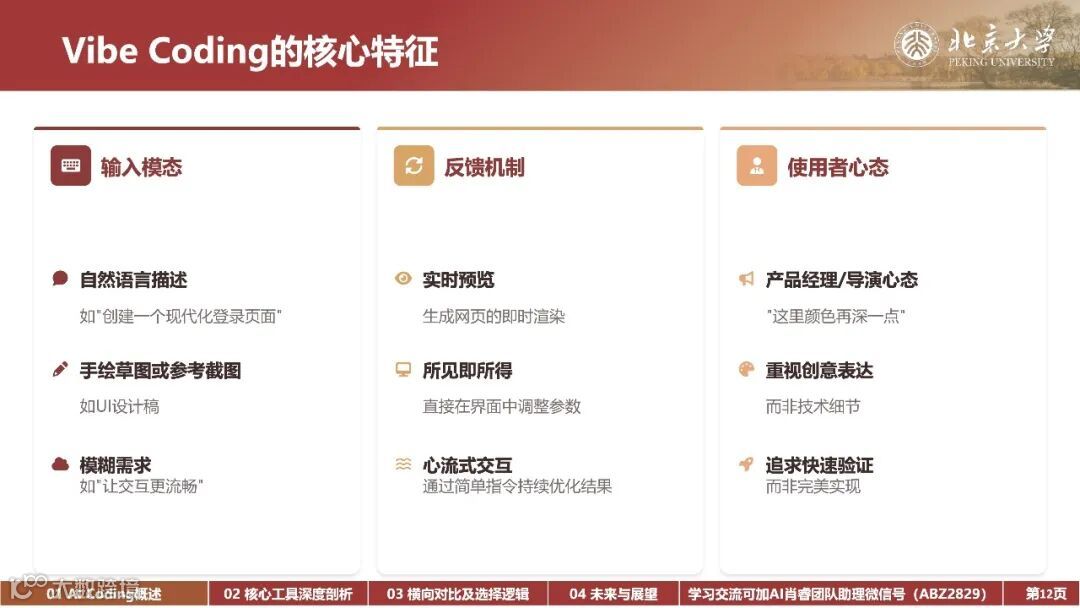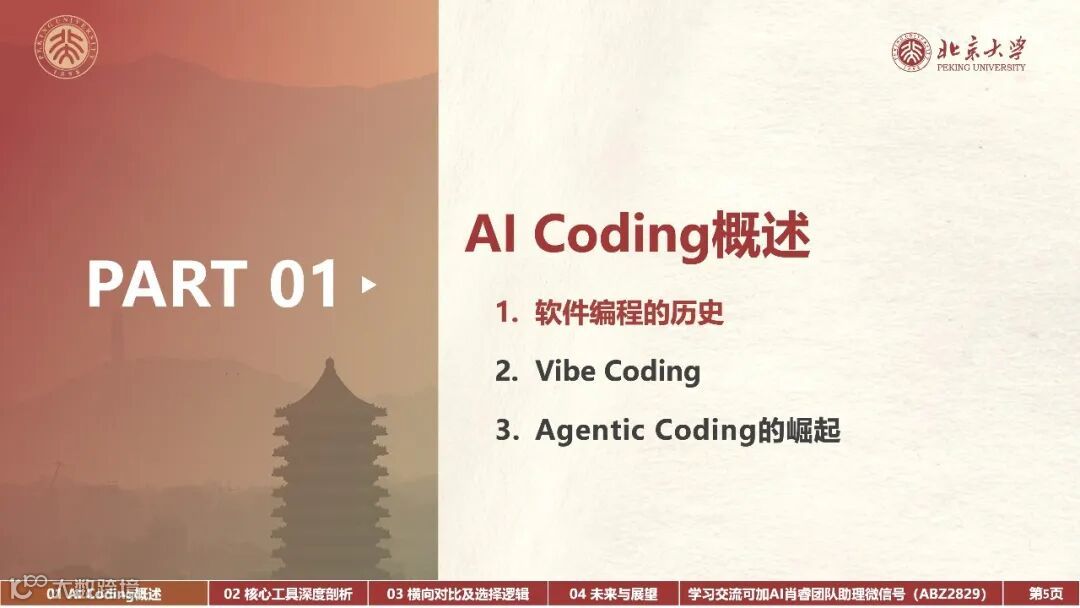 内容: AI编程工具的发展历程、Vibe Coding和Agentic Coding的核心特征及其对软件开发的影响、不同AI编程工具的比较与选择逻辑、以及未来AI编程的趋势和挑战。