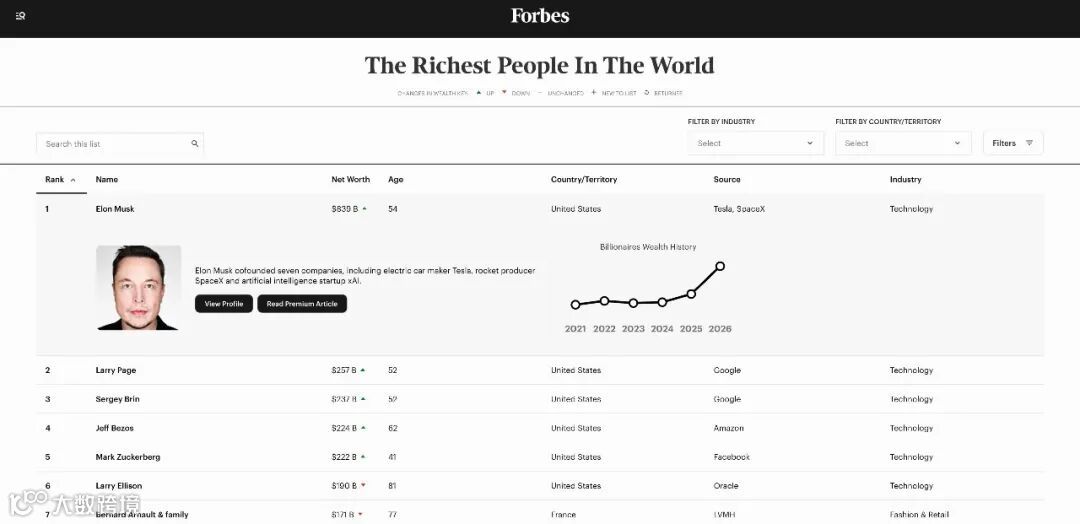 福布斯发布年度全球亿万富豪榜:马斯克蝉联榜首