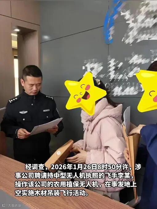 经调查,2026年1月26日8时50分许,涉事公司聘请持中型无人机执照的飞手李某,操作该公司的农用植保无人机,在事发地上空实施木材吊装飞行活动。