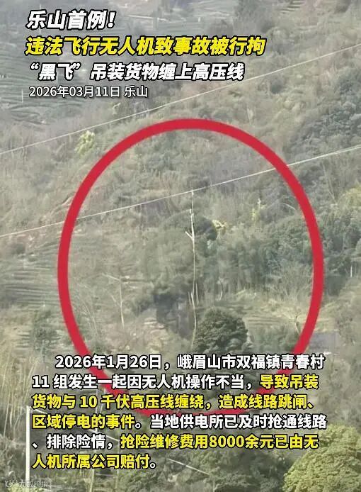 2026年1月26日,峨眉山市双福镇青春村11组发生一起因无人机操作不当,导致吊装货物与10千伏高压线缠绕,造成线路跳闸、区域停电的事件。当地供电所已及时抢通线路排除险情,抢险维修费用8000余元已由无人机所属公司赔付。