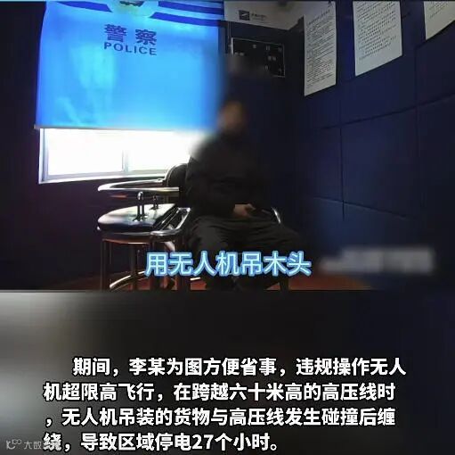 期间,李某为图方便省事,违规操作无人机超限高飞行,在跨越六十米高的高压线时,无人机吊装的货物与高压线发生碰撞后缠绕,导致区域停电27个小时。