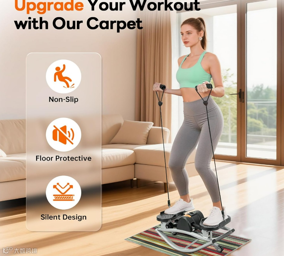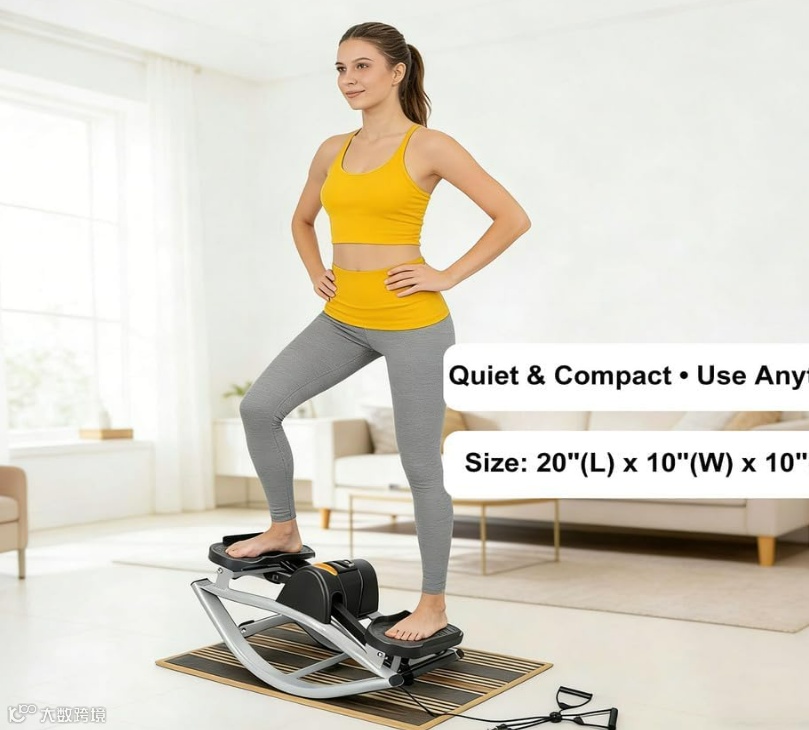 摇摆踏步机拥有坚固的U形框架和防滑踏板,可以将踏步动作与阻力带训练相结合,可以针对腿部、臀部和手臂进行锻炼,能特别激活臀部、大腿、臀肌和核心肌群。