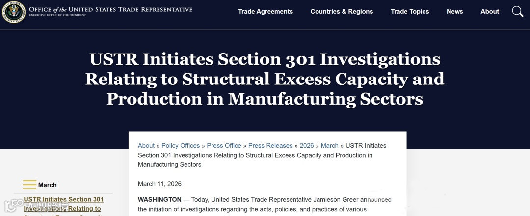 2026年3月11日,美国贸易代表办公室(USTR)发布公告,正式启动针对16个经济体的301条款调查。此次调查聚焦于制造业产能过剩,评估相关国家或地区的政策是否对美国商业构成不公平影响。