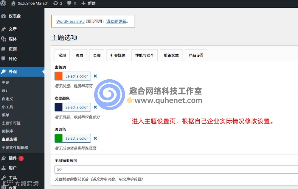 激活主题之后,进入主题选项页面,在这里可以针对你自己企业的实际情况对主题做一些细节上的设置,例如颜色,LOGO图片等。