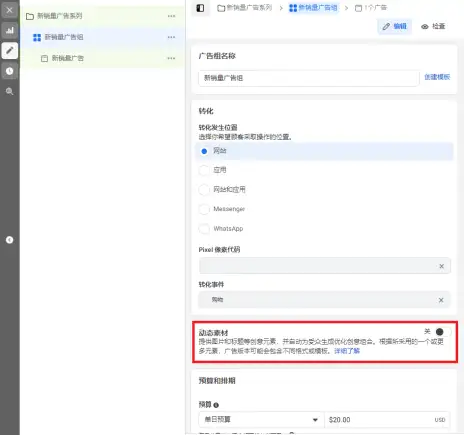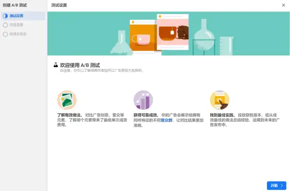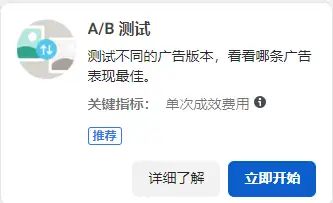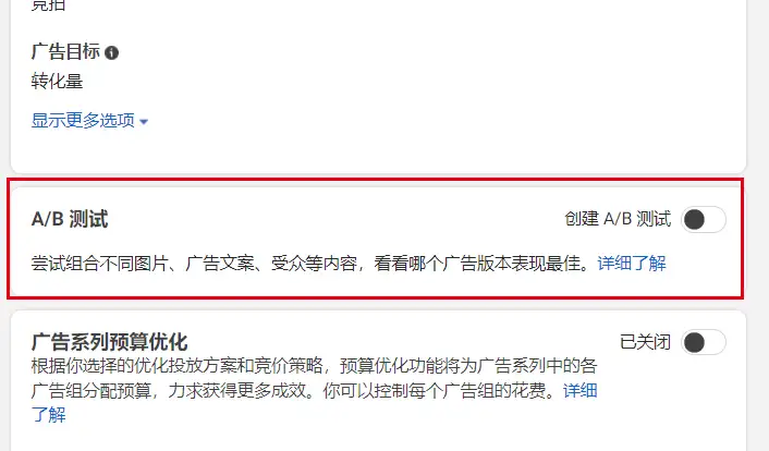 新建时可选择A/B测试,适合在新建广告系列时轻松测试某个变量。