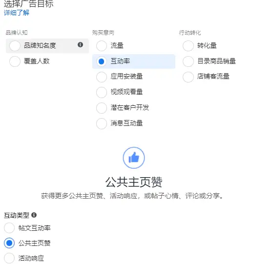 互动率:覆盖最有可能与帖子互动的用户,比如点赞、评论和分享,还可以引导用户在公共主页领取优惠等。借助投放公共主页赞广告,可以帮助增加粉丝数量。