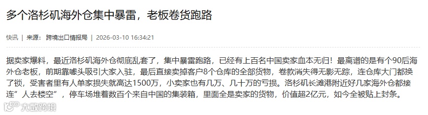 2025年底至2026年初,受关税政策调整预期影响,大量卖家集中“抢出口”,导致美西海外仓库存激增。部分本就存在财务隐患或经营不善的仓库,在需求退潮后迅速崩盘 [5] 。