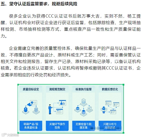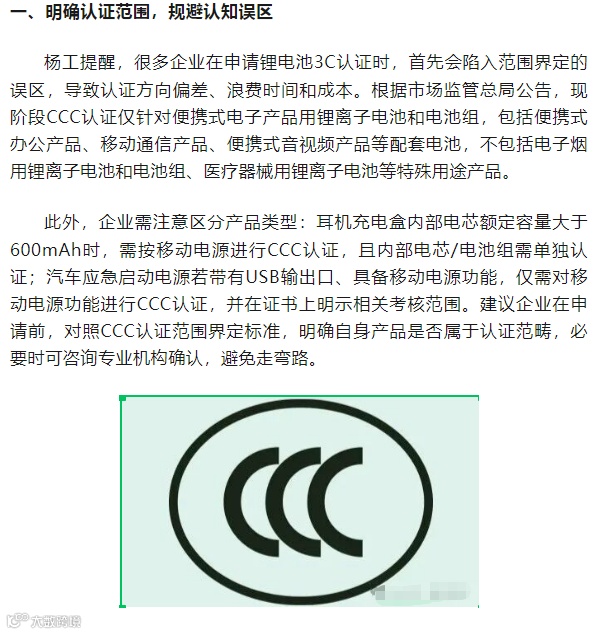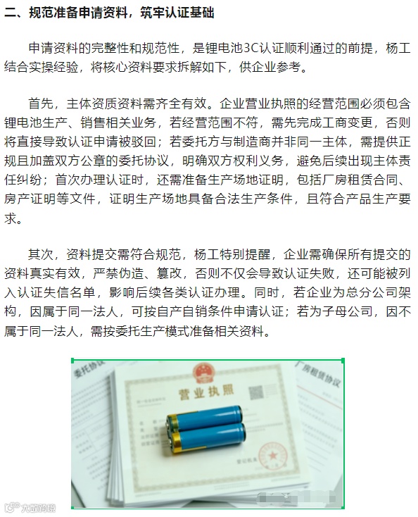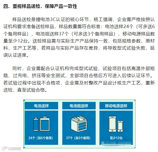 锂电池3C认证是一项系统性工程,涵盖认证范围界定、申请资料准备、技术文件编制、样品送检及获证后监管等全过程,任一环节疏漏均可能导致认证延期或失败 [5] 。杨工强调:企业须提升合规意识,严格对标国家标准与认证实施细则,强化从研发、采购到生产的全链条质量管控,坚守3C认证合规底线,方能顺利入市、规避安全与法律风险,支撑长期稳健发展。