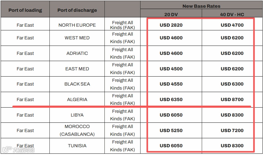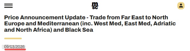 MSC于3月9日公告,自2026年3月22日起(有效期至3月29日),从远东各港(含日本、韩国及东南亚港口)至北欧、地中海(含西/东地中海、亚得里亚海、北非)及黑海港口的FAK(均一费率)全面调整。