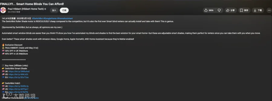 红人合作采取分层策略,以YouTube资深智能家居达人Paul Hibbert为例:合作视频标题《FINALLY!!... Smart Home Blinds You Can Afford!》直击价格痛点;内容突出“免打孔、易安装、搬家可带走”等租房友好特性 [6] 。