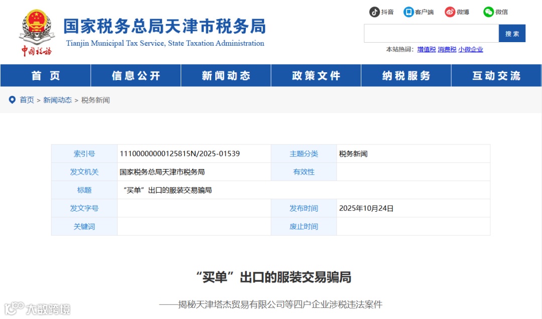 2026年2月27日,天津、黑龙江、贵州、重庆等地税务部门集中曝光4起骗取出口退税违法案件,涉案金额从183万元至2.01亿元不等,19名责任人被追究刑事责任。