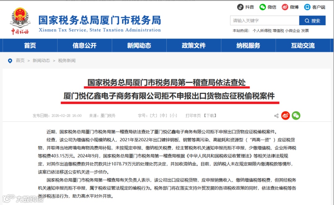 厦门悦**电商偷税案曝光,涉税违法监管持续加码