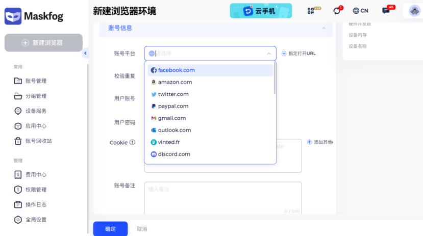 第一步:建立新的指纹浏览器环境(Profile) 在Maskfog后台点击“新建浏览器”,系统会自动生成一套全新的浏览器指纹配置。您也可以根据需求手动调整操作系统、浏览器内核、分辨率等参数,实现深度定制。