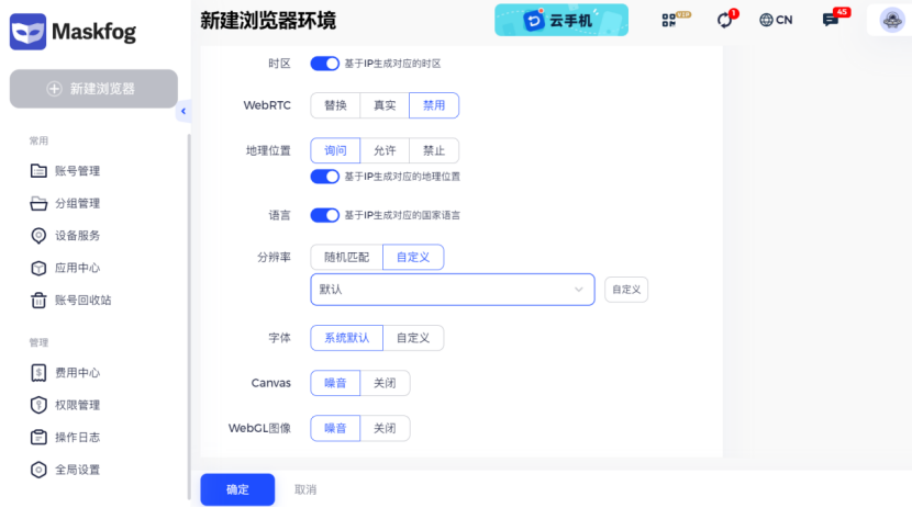 指纹浏览器是一种专门为多账号安全隔离而生的工具。它的核心原理是在浏览器底层对设备信息进行深度“伪装”和混淆,为每个浏览器窗口生成一套独一无二的软硬件指纹(包括Canvas噪声、WebGL渲染、时区、语言、分辨率甚至音频设备等),以Maskfog指纹浏览器为例,我们可以通过实操对比: