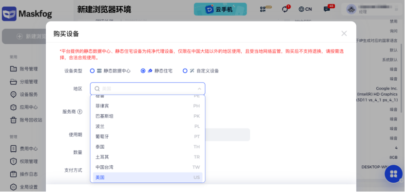 第二步:绑定内置静态住宅IP 在环境配置中选择“绑定代理IP”,Maskfog内置了纯净的静态住宅IP资源,您可以直接选用或导入自己的IP。这一步实现了“独立指纹+独立IP”的强绑定,模拟出真实的物理设备网络环境。