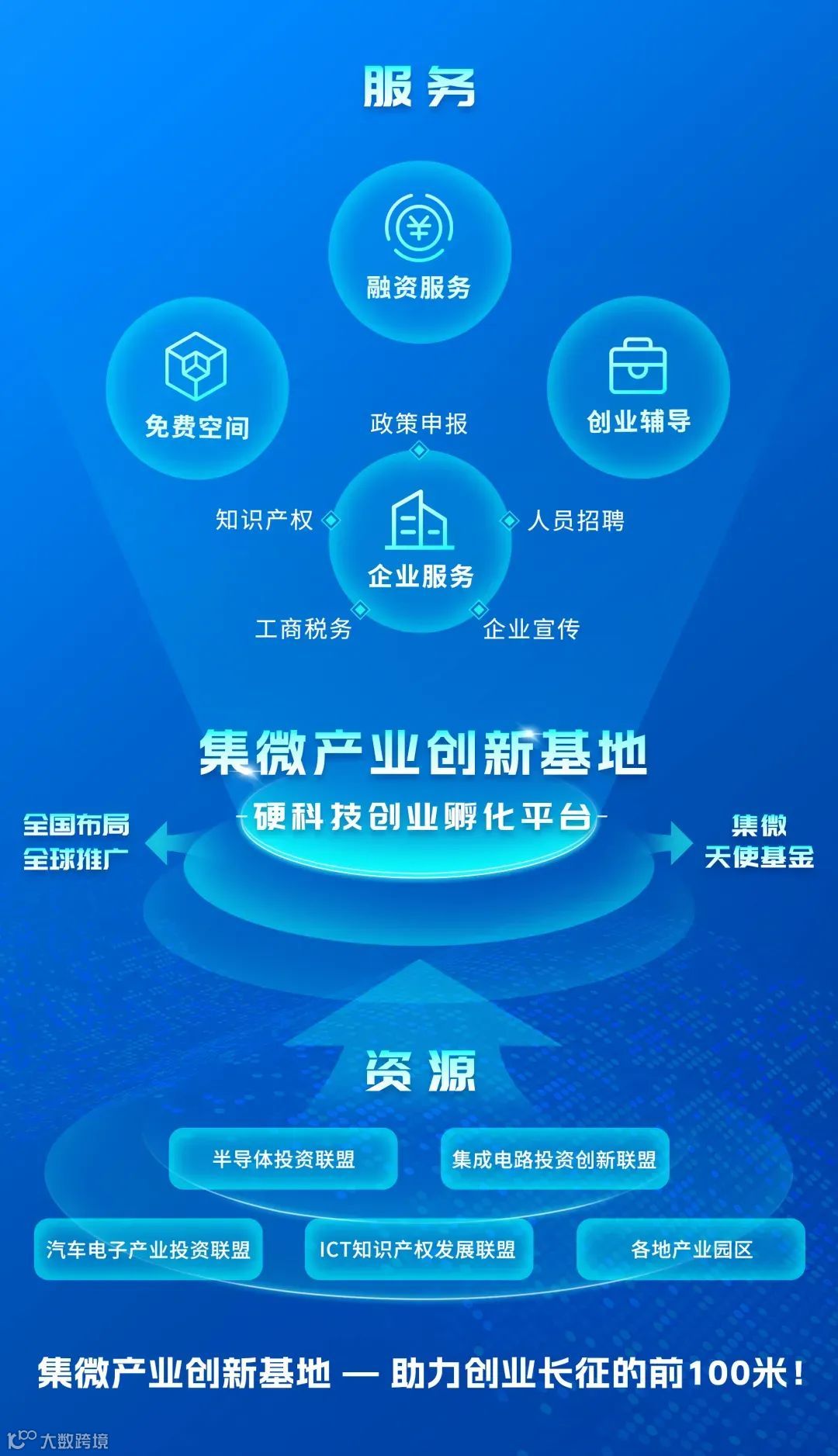 集微产业创新基地是由专业的ICT产业互联网平台爱集微主导发起,依托集微天使基金,联合国内主要地方园区及投资机构,共同打造的集科技创新、产业发展、项目孵化、成果转化、人才招引于一体的硬科技产业创新创业孵化平台。通过投融资、办公空间、知识产权、人才、培训及政策咨询等多种手段,助力催化企业成长,跨越创业长征的“前一百米”,推动中国硬科技做大做强。