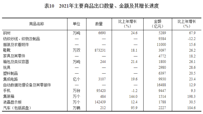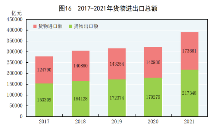 根据官方数据显示,近年来我国出口额不断增长,2021年进出口总额为391009亿元,其中出口额达217348亿元,较2020年增长21.4%,实现历史新高度。