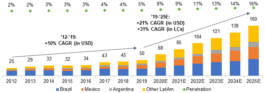 数据来源:摩根士丹利,2021 年 2 月,拉丁美洲电子商务