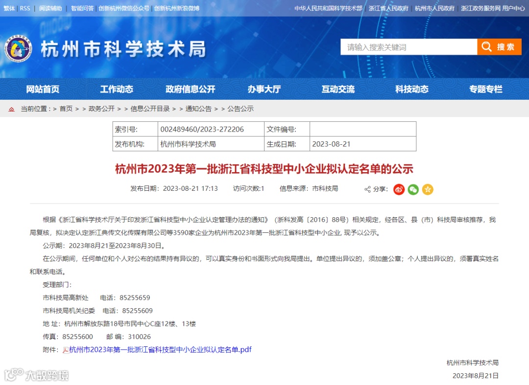 杭州市科学技术局公示了
