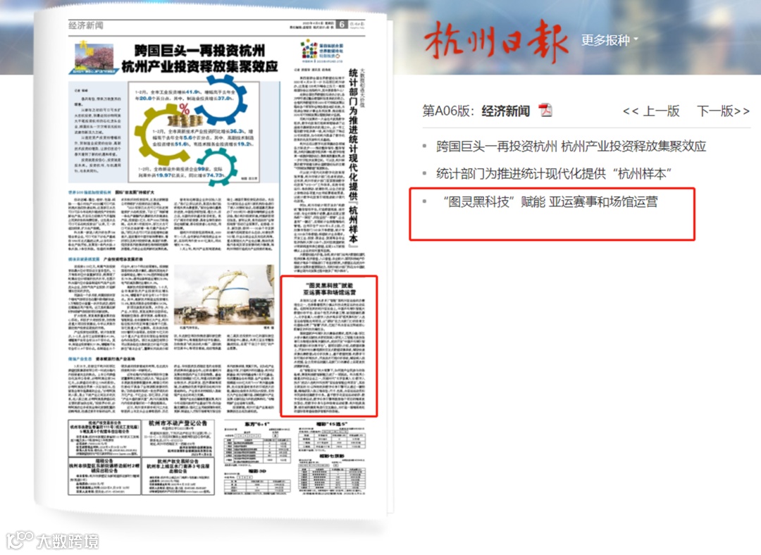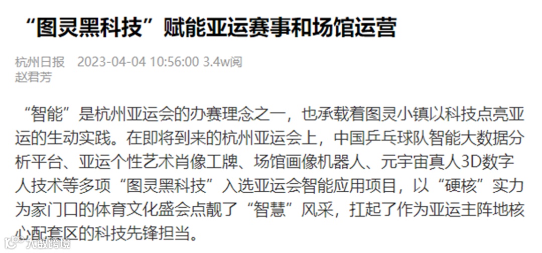4月6日,《杭州日报》刊登了题为《“图灵黑科技”赋能亚运赛事和场馆运营》的报道,通过介绍中国乒乓球队智能大数据分析平台、元宇宙真人3D数字人技术等多项入选亚运会智能应用项目的“图灵黑科技”,点赞小镇以“硬核”科技实力为家门口的体育文化盛会点亮“智慧”风采。