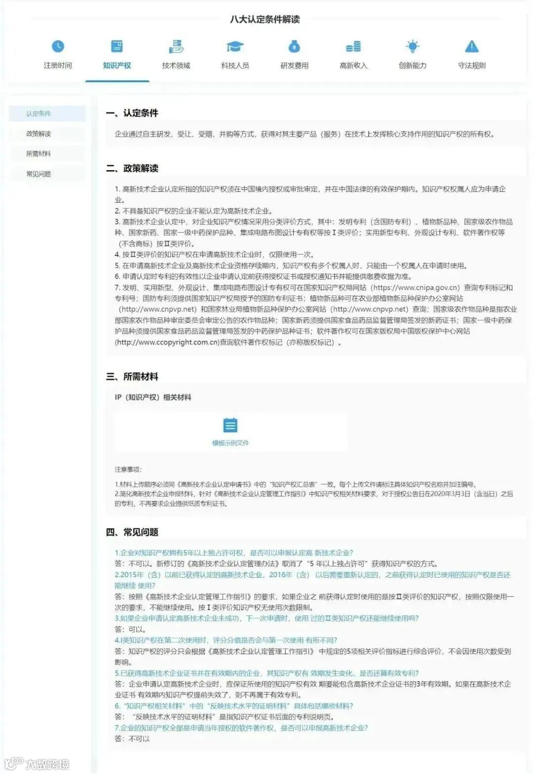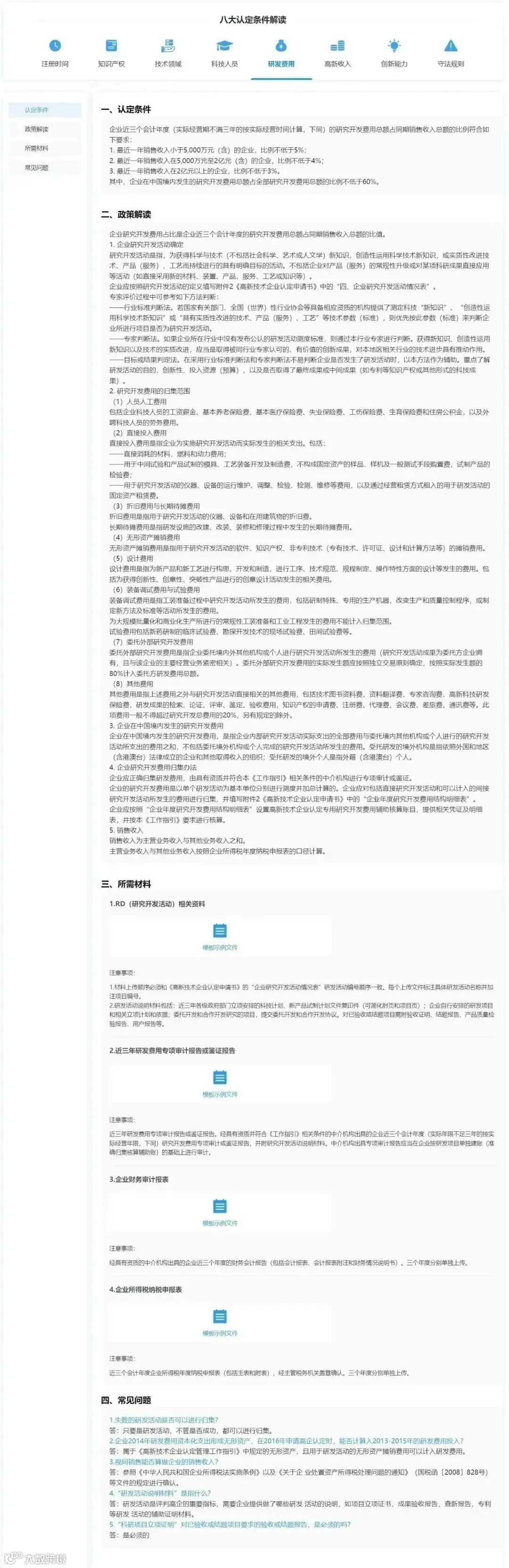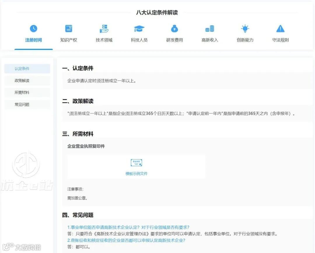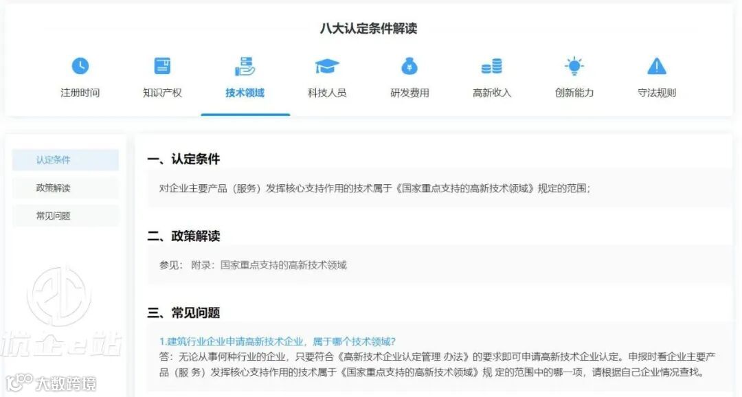 3.选择【辅助申报】的【立即前往】,查看高新技术企业的八大认定条件与解读。