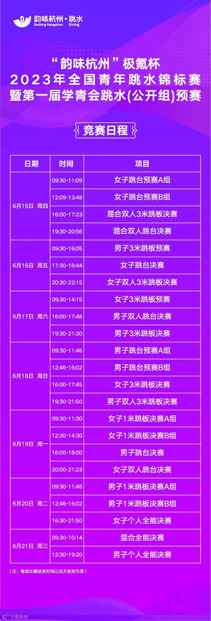 本次比赛将于6月15日-21日在杭州奥体中心游泳馆举办,这既是2023年全国跳水锦标赛的资格赛,也是第一届全国学生青年运动会跳水项目(公开组)的预赛,将有来自全国各地20支代表队的290余名运动员参加。