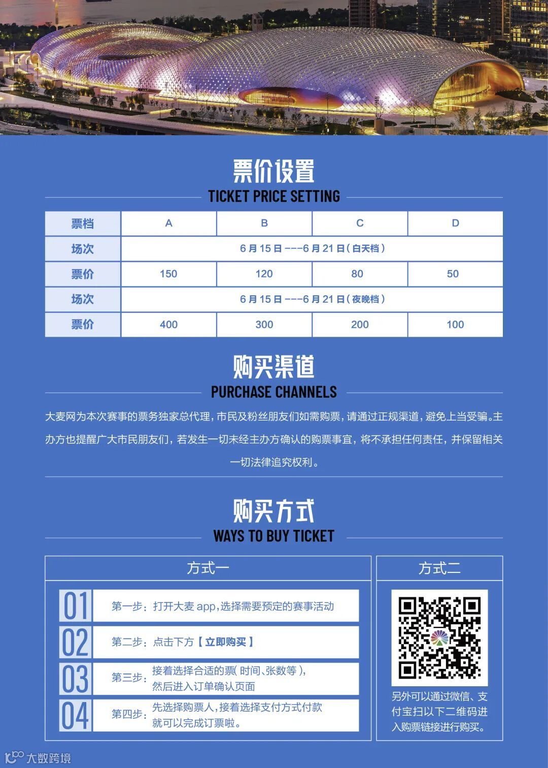 目前,赛事门票预售通道已火热开启,市民朋友可通过“大麦”App、小程序等购票。也可通过微信、支付宝扫下方二维码进入购票链接进行购买。票价设置在50元至400元之间,包括白天场和夜晚场。