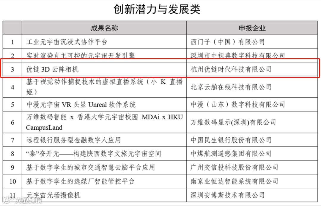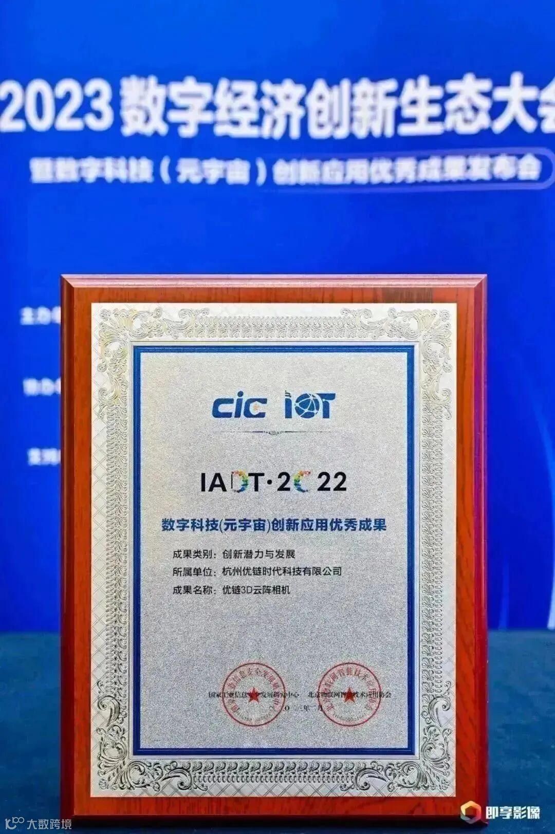 近日,由国家工业信息安全发展研究中心、北京物联网智能技术应用协会共同主办的2023数字经济创新生态大会暨数字科技(元宇宙)创新应用优秀成果发布会顺利举行。会上,图灵小镇企业杭州优链时代科技有限公司的“优链3D云阵相机”荣获“数字科技(元宇宙)创新应用创新潜力与发展类优秀成果”。