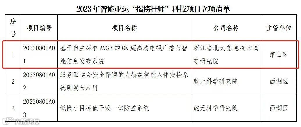 近日,2023年智能亚运“揭榜挂帅”科技项目立项清单公布。萧山图灵小镇重点科研平台项目——浙江省北大信息技术高等研究院主持研发的“基于自主标准AVS3的8K超高清电视广播与智能信息发布系统”入选立项。