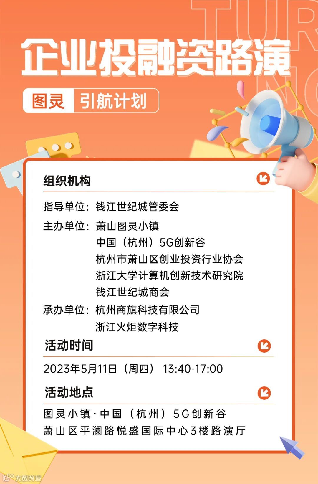 图灵小镇·中国(杭州)5G创新谷(萧山区平澜路518号悦盛国际中心3楼路演厅)