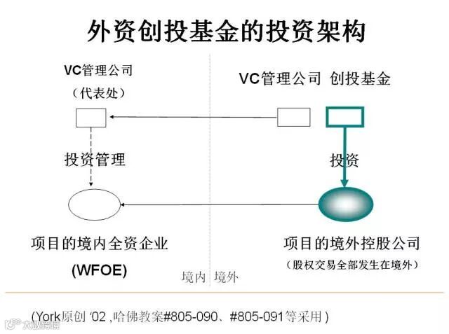 如上图的“两头在外”架构安排,境外的创投管理公司透过其境内的代表处物色投资项目,但创投基金并不直接跨境投入到境内项目,而是投资到该项目设在海外的控股公司(一般在开曼群岛),项目的后续融资、上市或被并购等股权交易行为,也都发生在境外。