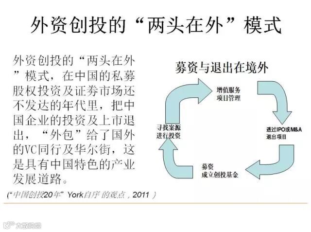 如我的书“中国创投20年”自序里的观点,我认为:外资创投的“两头在外”模式,是在中国的私募股权投资及证劵市场还不发达的年代里,把中国企业的投资及上市退出,“外包”给了国外的VC同行及华尔街,这是具有中国特色的产业发展道路。