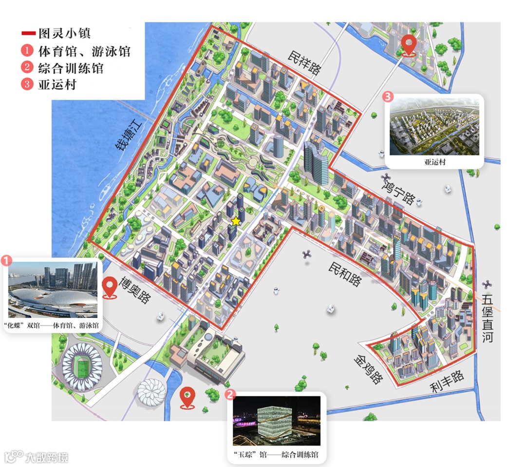 图灵小镇取名源自于计算机、人工智能之父——艾伦•图灵,寓意小镇是围绕计算机技术和人工智能方向的产业集聚区。小镇位于钱江世纪城最核心最优势的区块,与钱江新城拥江而立,处于杭州新城市 CBD、钱塘江一线江景地带,是杭州市未来城市新中心。图灵小镇于 2017 年首次亮相,2018 年被列入省级特色小镇第三批培育名单, 2019 年被列入省级特色小镇第五批创建名单,2020 年入选“杭州数字经济旅游十景”,2022年获评国家AAA级旅游景区。