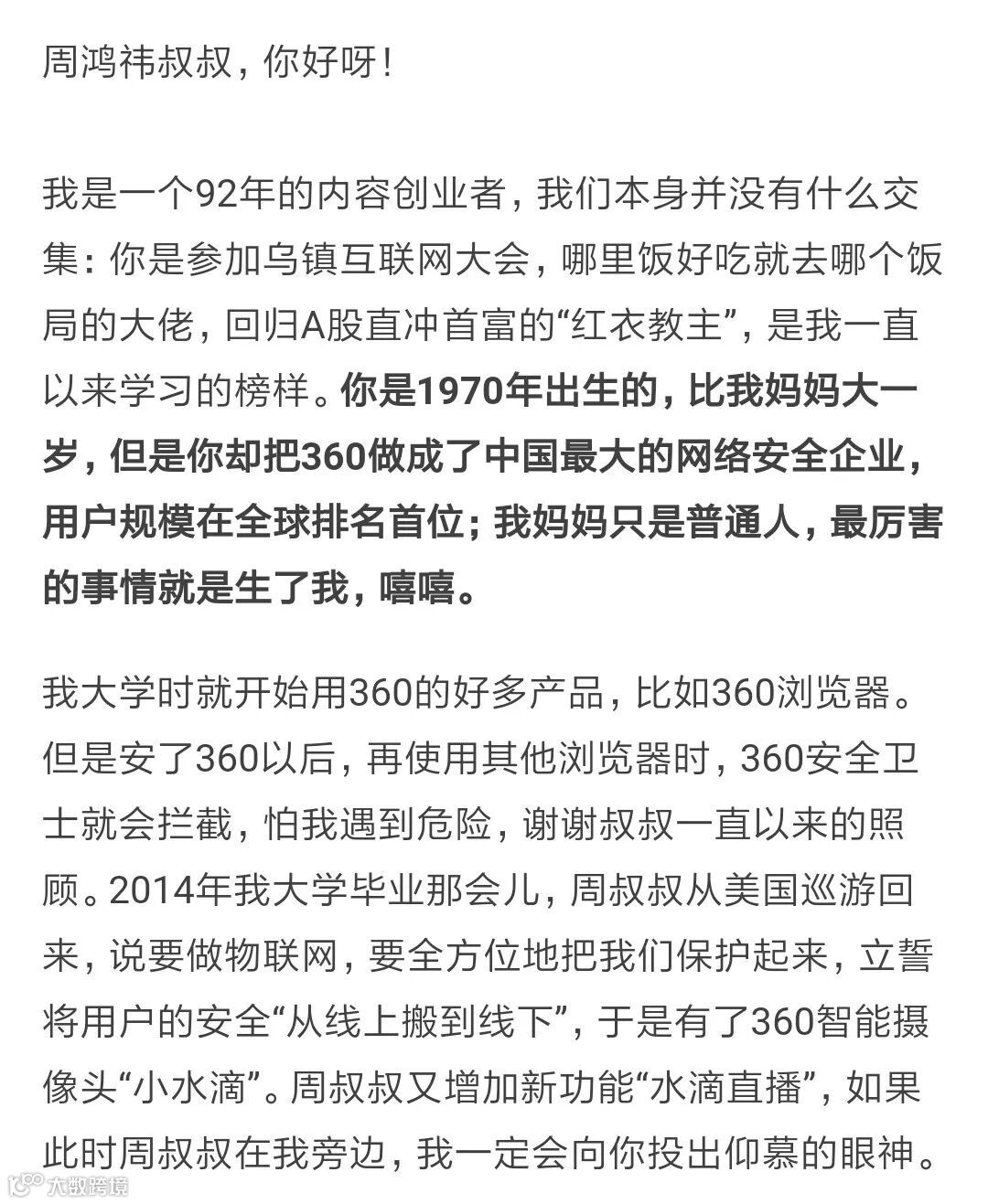 这事儿是从一篇名为《一位92年女生至周鸿祎:别再盯着我们看了》文章引起的,正文开篇作者就以孩子的身份向周鸿祎叔叔致敬,表现出了晚辈对前辈的无比敬拜!