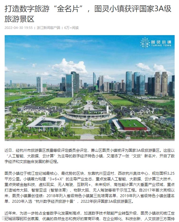 图灵小镇取名源自于计算机、人工智能之父——艾伦•图灵,寓意小镇是围绕计算机技术和人工智能方向的产业集聚区。小镇位于钱江世纪城最核心最优势的区块,与钱江新城拥江而立,处于杭州新城市 CBD、钱塘江一线江景地带,是杭州市未来城市新中心。图灵小镇于 2017 年首次亮相,2018 年被列入省级特色小镇第三批培育名单, 2019 年被列入省级特色小镇第五批创建名单,2020 年入选“杭州数字经济旅游十景”。