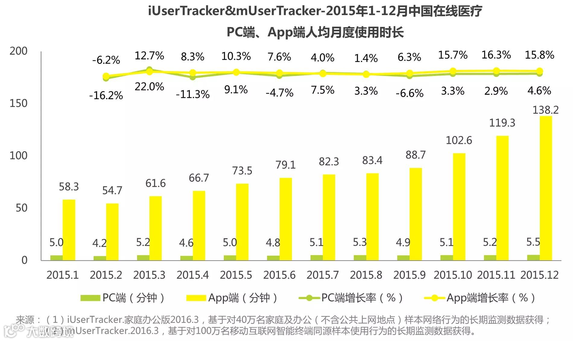 艾瑞iUserTracker和mUserTracker监测数据显示,2015年1至12月在线医疗行业App端人均月度使用时长逐月上升,12月增长至138.2分钟,而PC端人均月度使用时长则在5分钟左右波动,App端人均月度使用时长远远高于PC端,且逐渐同PC端形成巨大差距。