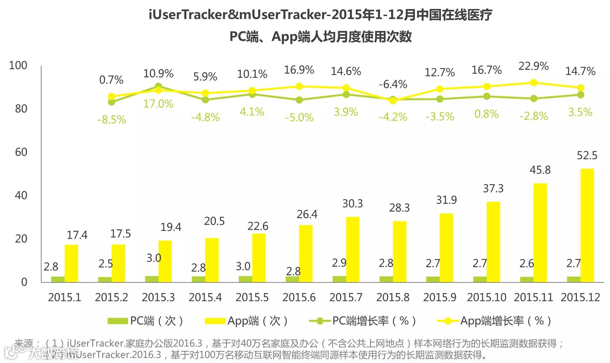 艾瑞iUserTracker和mUserTracker监测数据显示,2015年1至12月在线医疗行业App端人均月度使用次数逐月上升,12月增长至52.5次,而PC端人均月度使用次数则在3次左右波动,App端人均月度使用次数明显高于PC端,且逐渐同PC端形成巨大差距。