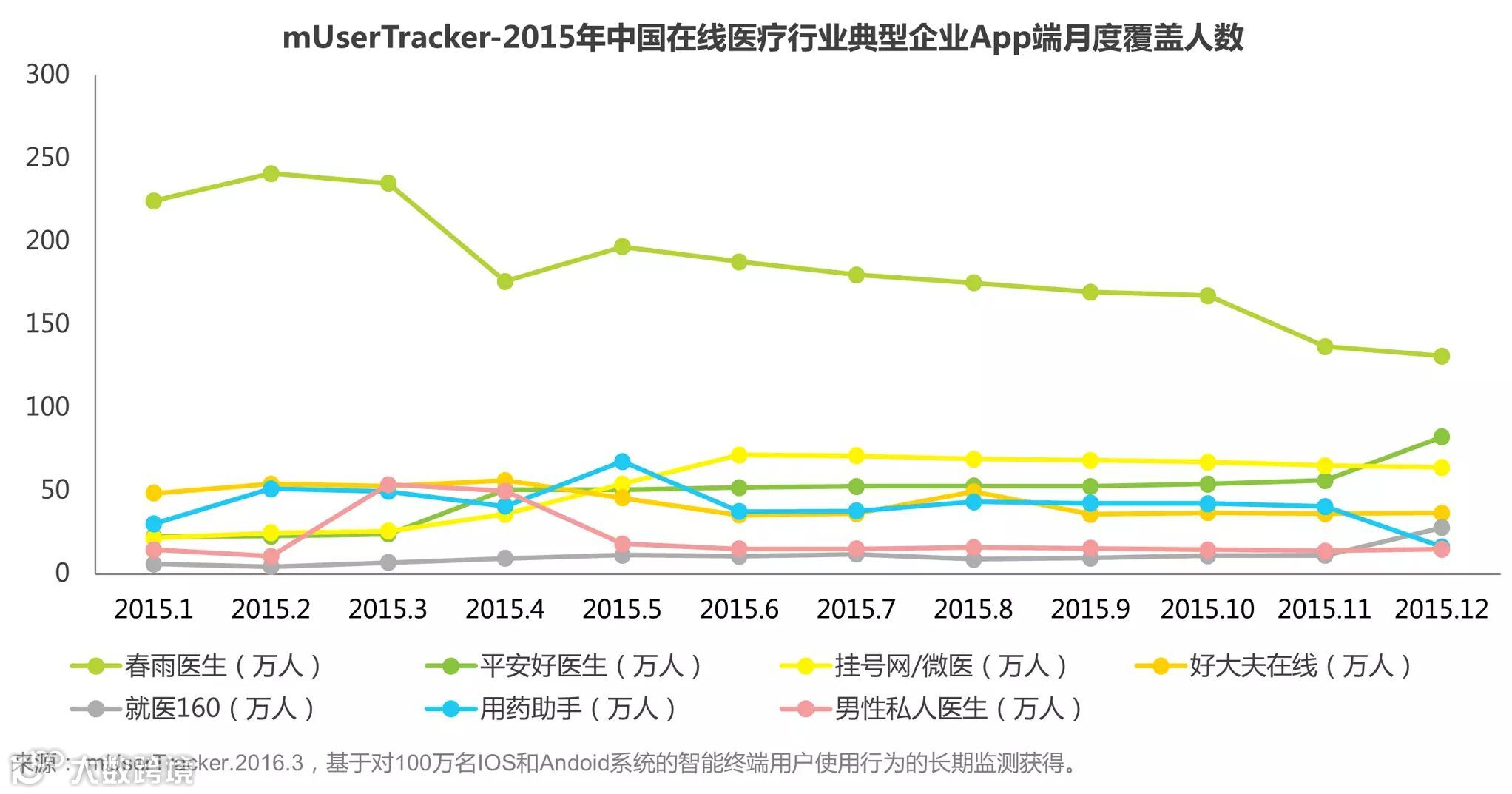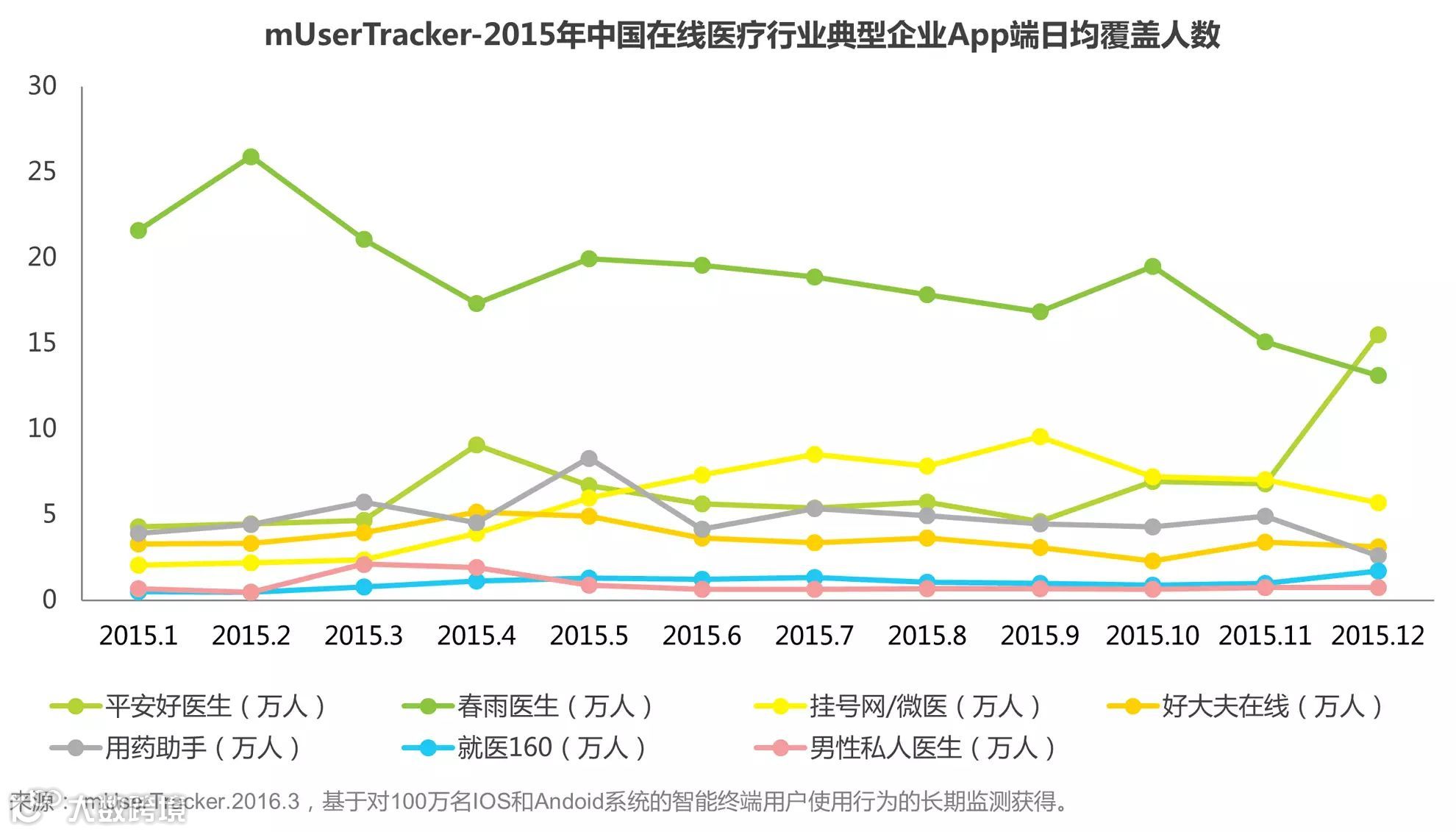 艾瑞iUserTracker监测数据显示,除健康保健类,2015年1-11月春雨医生App端日均覆盖人数处于领先地位;平安好医生增长迅速,在12月日均覆盖人数超越春雨医生。