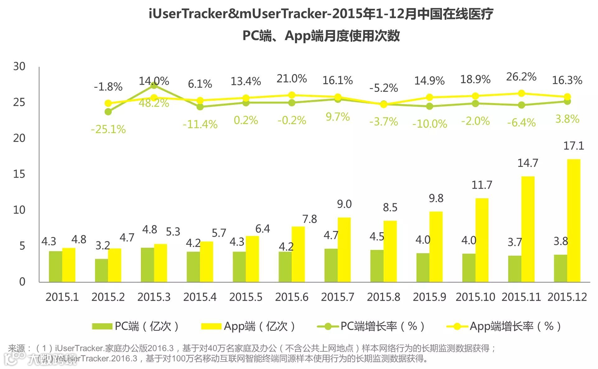 艾瑞iUserTracker和mUserTracker监测数据显示,2015年1至12月在线医疗行业App端月度使用次数逐月上升,12月更是增长至17.1亿次,而PC端则保持在4亿次左右,App端同PC端差距逐步拉大。