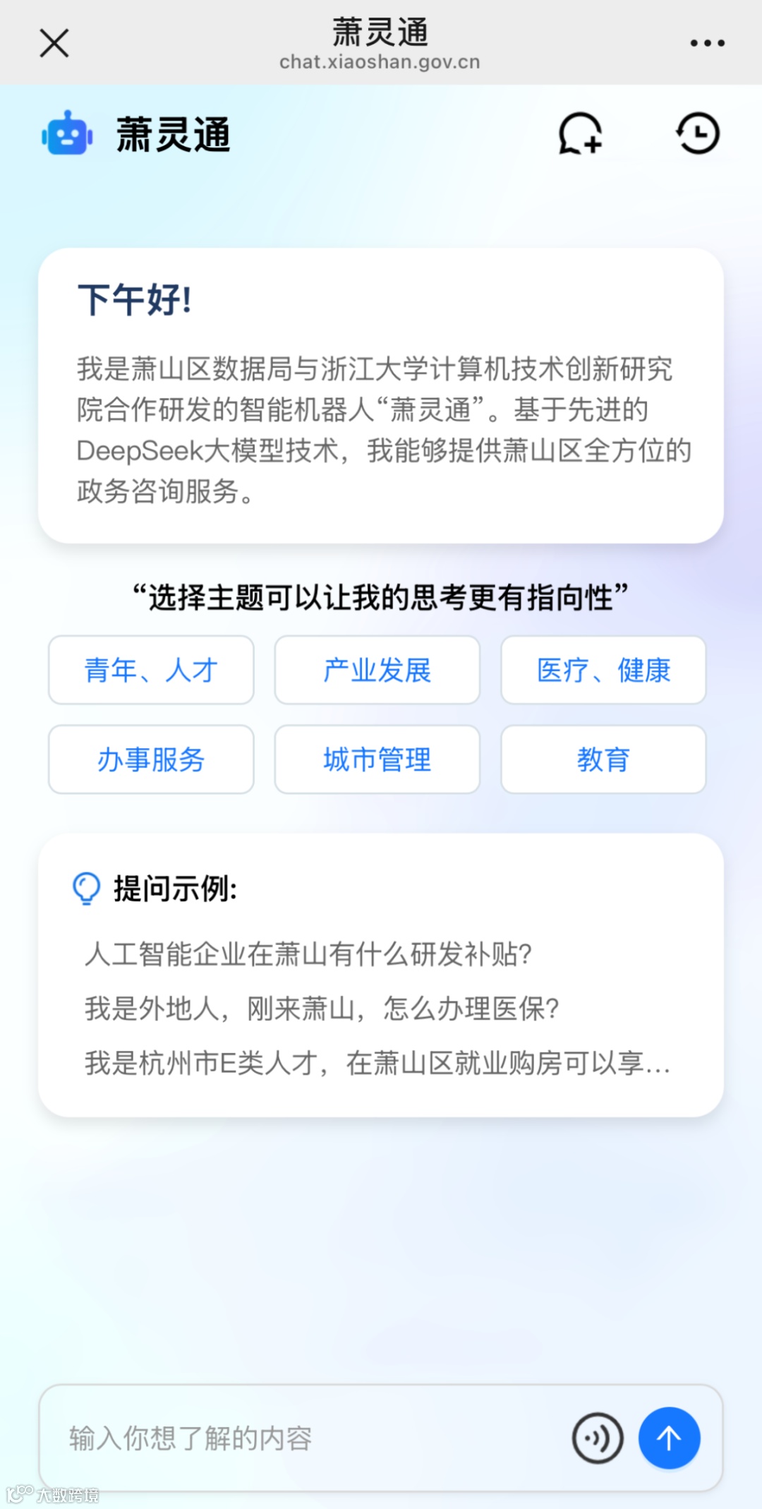 此外,萧山区数据局联合浙大计创院,基于国产DeepSeek深度学习大模型,于近日正式推出智能政策问答助手“萧灵通”,以AI技术赋能政务服务,实现政策查询“零时差”、办事指引“零障碍”,为企业和居民打造全天候、精准化的政策服务新体验。